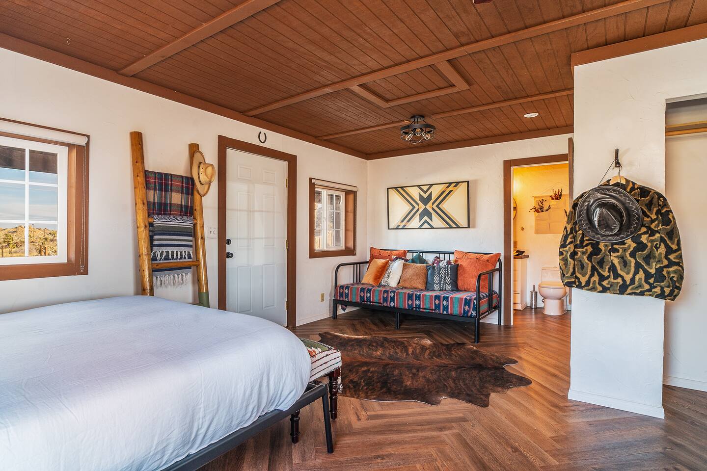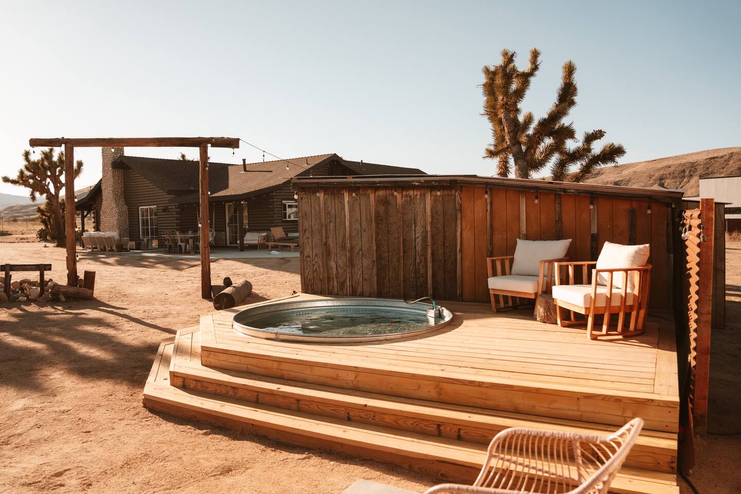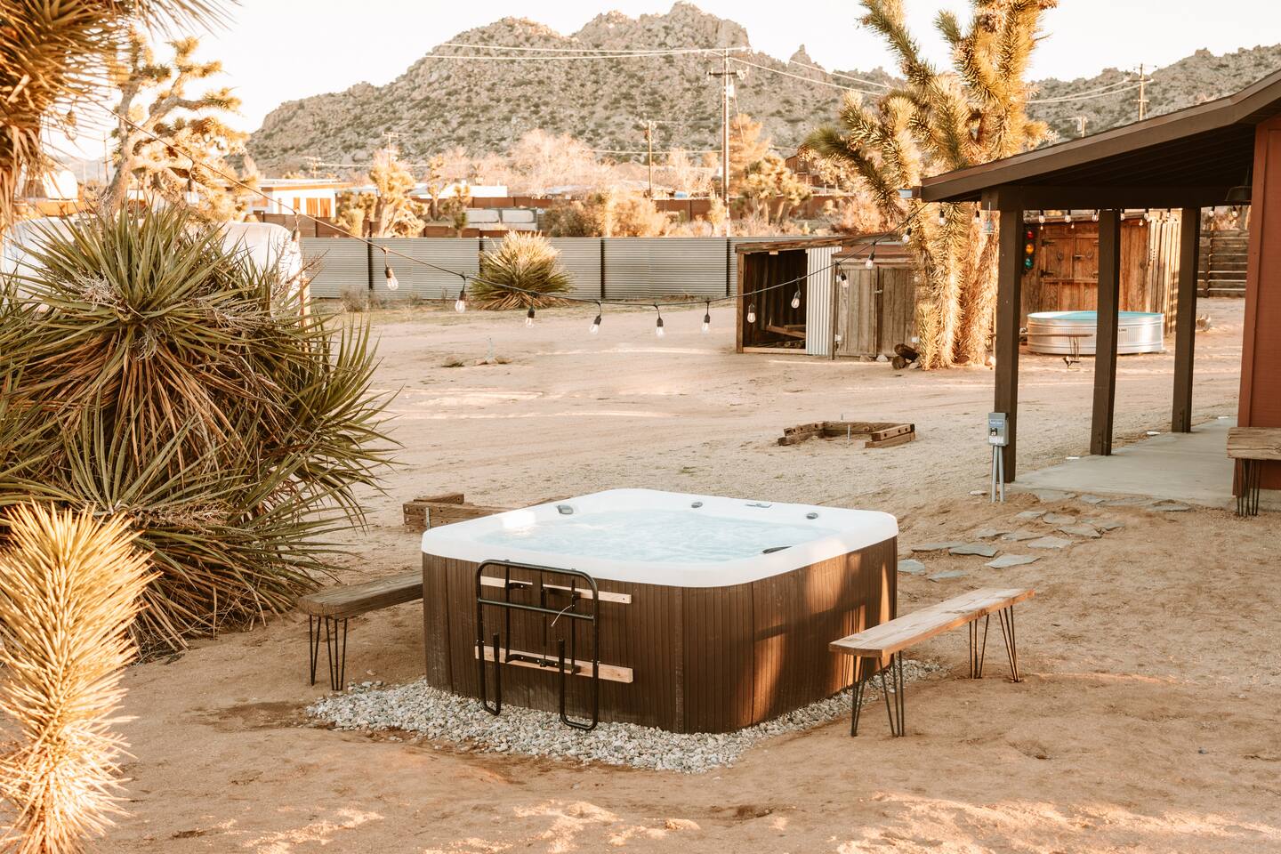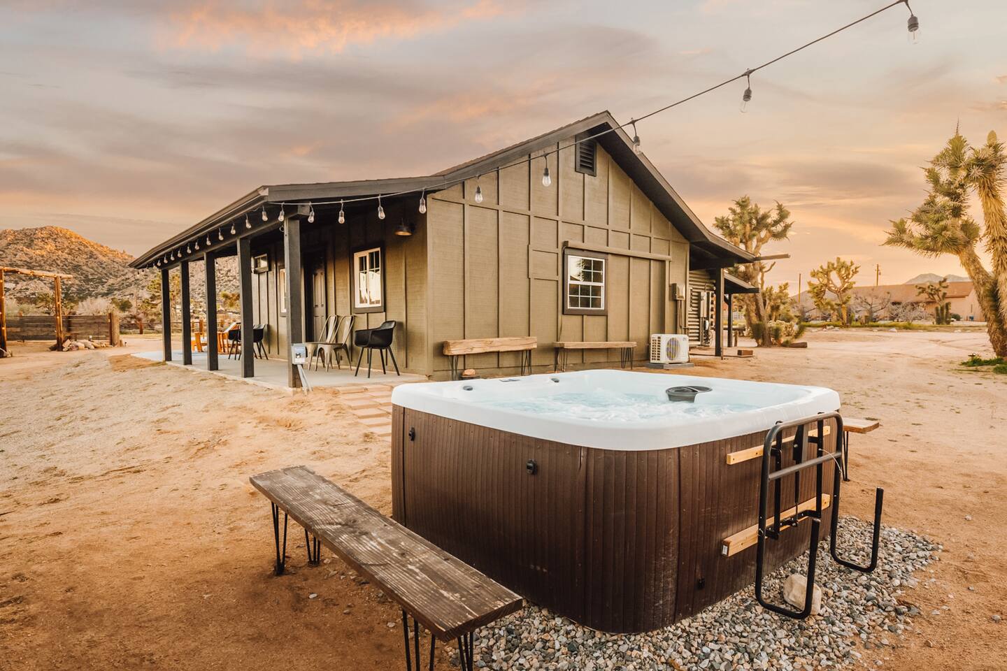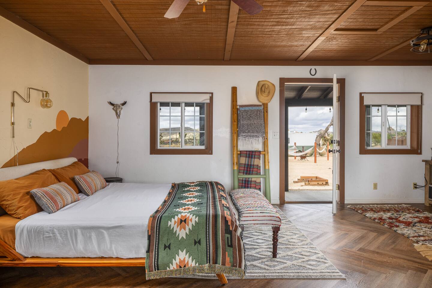 ★ BEDS & BATHS ★ Sleeps 8 across 4 rooms with 4 beds and 3 full bathrooms (2 showers + jacuzzi tub). • Front Bedroom: King bed, Tuft & Needle mattress, tv, two en-suite bathrooms—one with shower and laundry, one with jacuzzi tub. • Master Bedroom: King Casper bed, modular sofa, en-suite bath, and two patios. • Loft: Queen mattress, open space with its own heating/cooling. • Middle bedroom: Queen bed, TV, access to a shared en-suite bathroom. It connects kitchen and master with a privacy door. ★ KITCHEN & DINING ★ Fully stocked kitchen with ceramic glass stove, oven, microwave, dishwasher, drip coffee maker, and DeLonghi pod machine. Dine indoors or outside with views. Propane BBQ included. No range hood—please use the splash guard. ★ LIVING ROOM ★ Airy and open with 16-ft ceilings, two couches, a flatscreen TV, and a cozy lounge nook. Connects to kitchen, front entrance, and patio. ★ THE SALOON ★ Converted horse stable with sectional, bar stools, upright piano, and a desert-facing window bar. Opens to the outdoor deck. ★ OUTDOORS ★ Multiple lounging areas, fenced yard, hammocks, games, hot tub, swing, and a built-in 8-ft cowboy pool (note the stock tank pool is available from Memorial Day - Halloween) ★ PARKING & AMENITIES ★ U-shaped driveway, Tesla charger. 4 mini-splits, pellet stove, and propane fireplace. ★ REMOTE WORK & FAMILY FRIENDLY ★ Fast Wi-Fi, dedicated workstation, pet welcome kit, board games, and outdoor space for kids. ★ FOLLOW US ★ @ houseof.roy | #houseofroy | Tag “House of Roy” Hosted by Viktor & Meghan ★ AIRPORTS ★ PSP – 45 min | LAX & SAN – 2.5 hrs