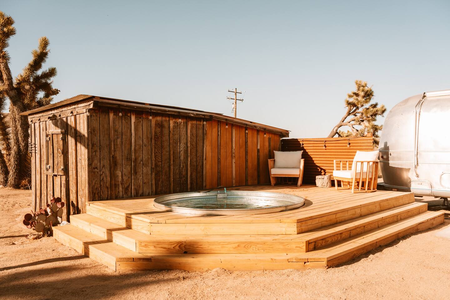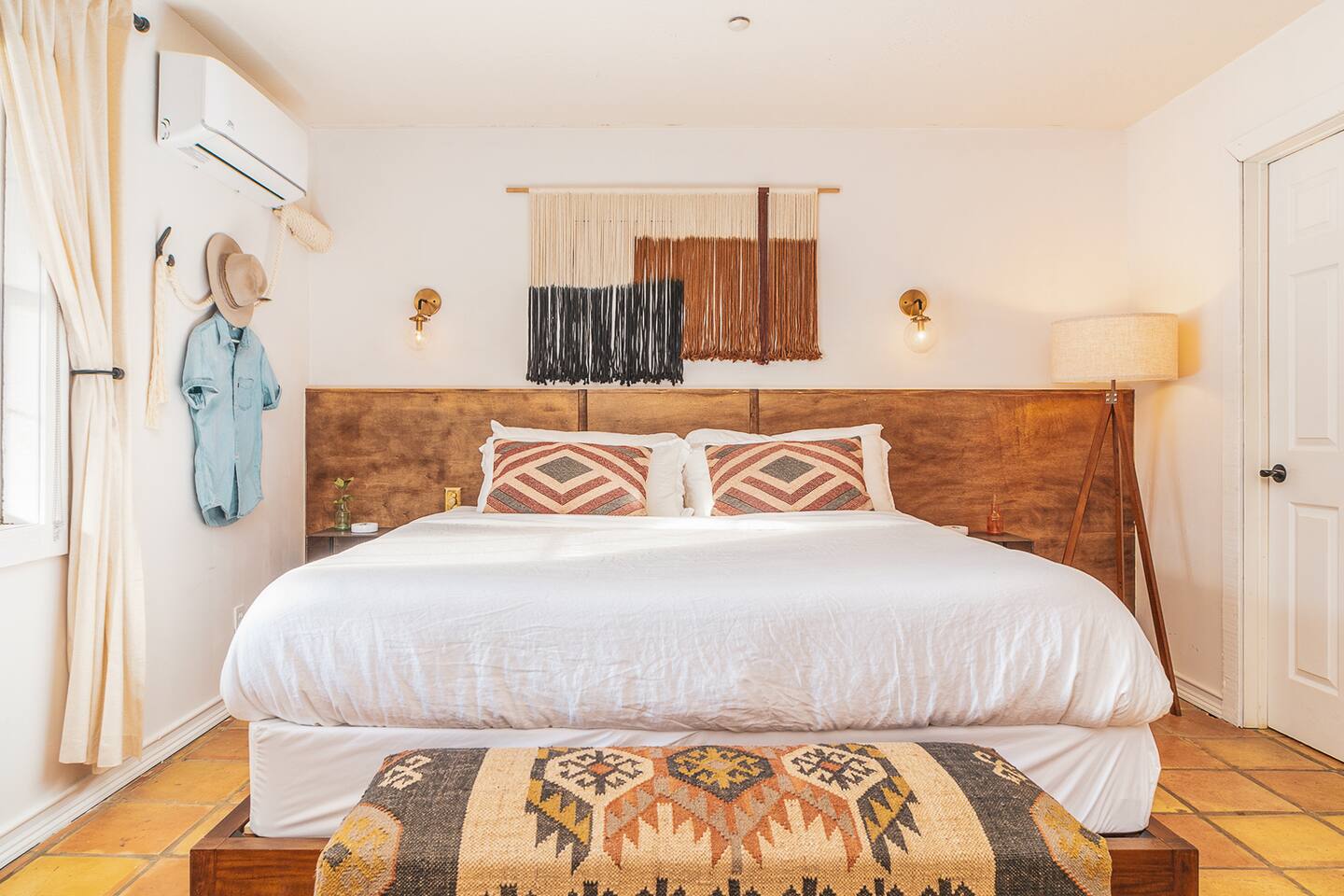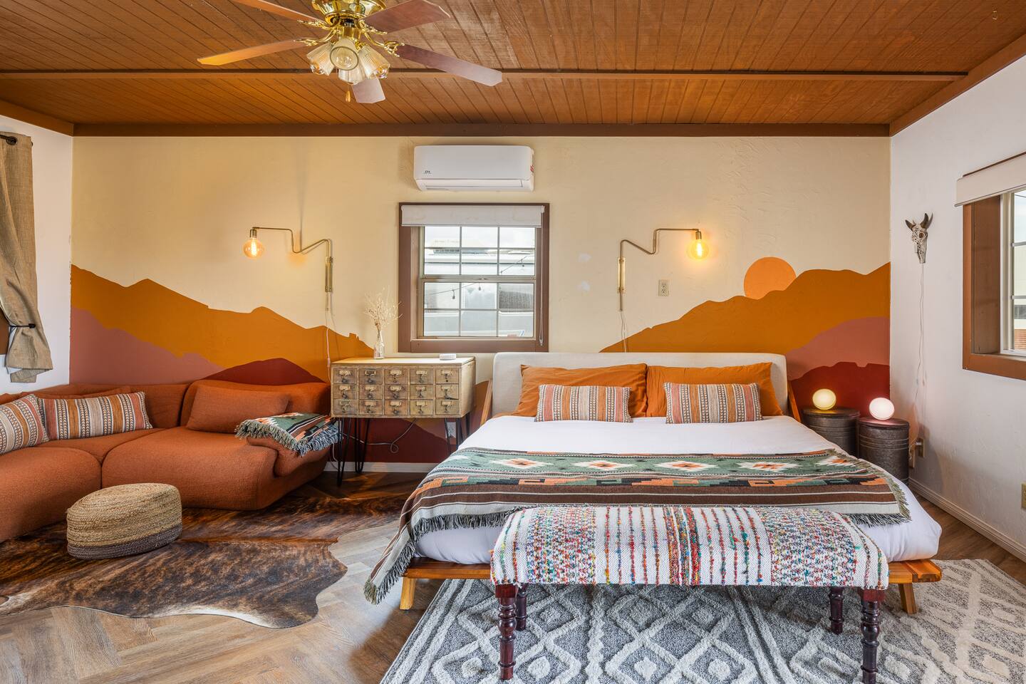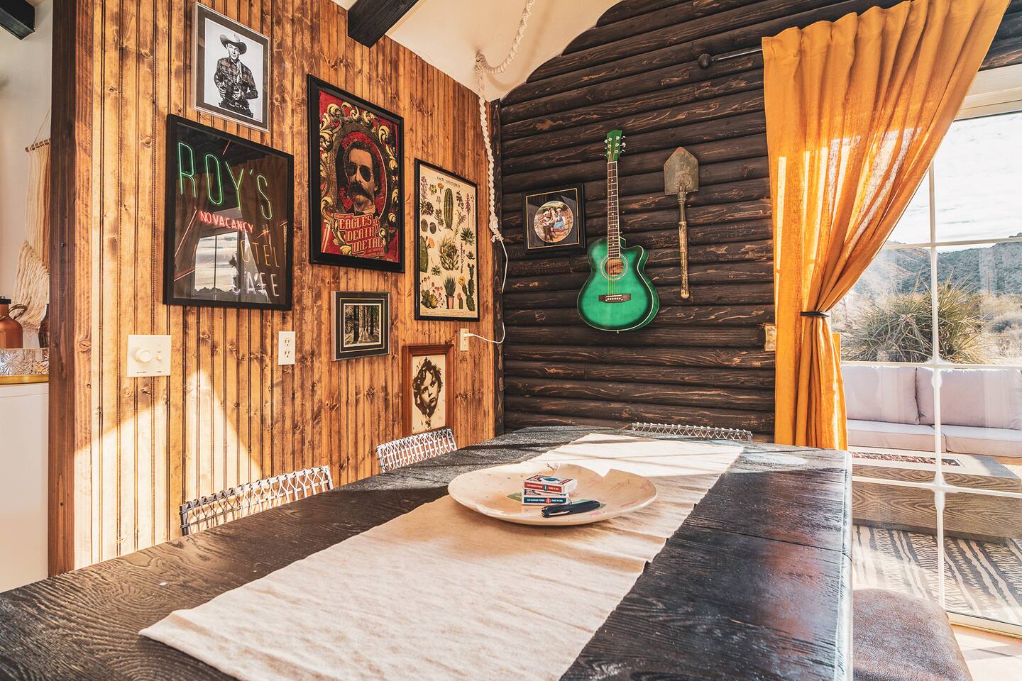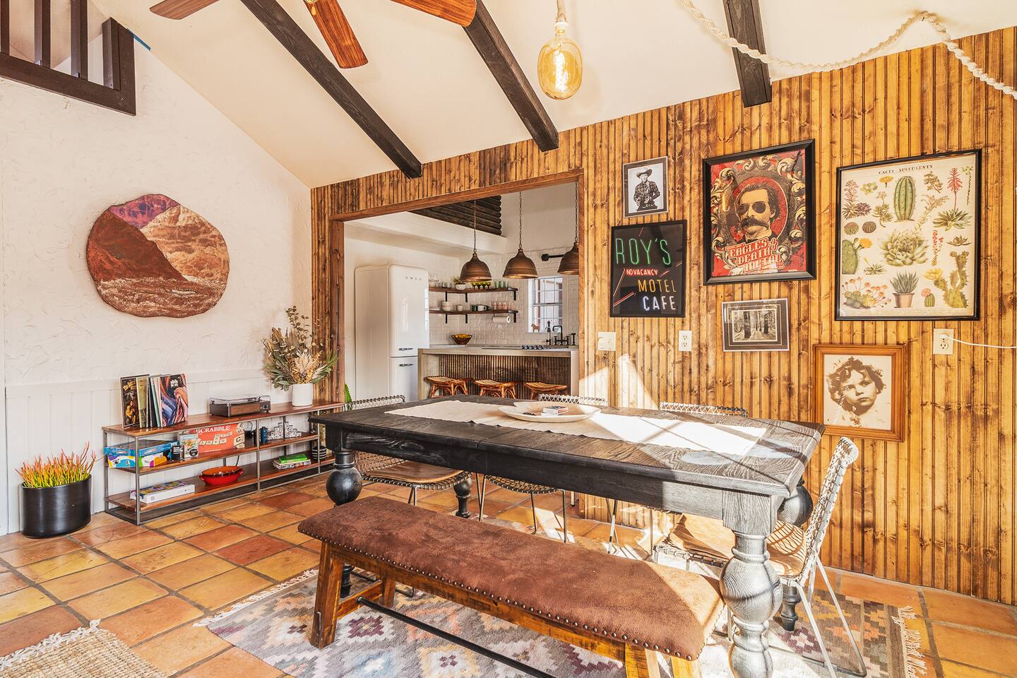 ★ BEDS & BATHS ★ Sleeps 8 across 4 rooms with 4 beds and 3 full bathrooms (2 showers + jacuzzi tub). • Front Bedroom: King bed, Tuft & Needle mattress, tv, two en-suite bathrooms—one with shower and laundry, one with jacuzzi tub. • Master Bedroom: King Casper bed, modular sofa, en-suite bath, and two patios. • Loft: Queen mattress, open space with its own heating/cooling. • Middle bedroom: Queen bed, TV, access to a shared en-suite bathroom. It connects kitchen and master with a privacy door. ★ KITCHEN & DINING ★ Fully stocked kitchen with ceramic glass stove, oven, microwave, dishwasher, drip coffee maker, and DeLonghi pod machine. Dine indoors or outside with views. Propane BBQ included. No range hood—please use the splash guard. ★ LIVING ROOM ★ Airy and open with 16-ft ceilings, two couches, a flatscreen TV, and a cozy lounge nook. Connects to kitchen, front entrance, and patio. ★ THE SALOON ★ Converted horse stable with sectional, bar stools, upright piano, and a desert-facing window bar. Opens to the outdoor deck. ★ OUTDOORS ★ Multiple lounging areas, fenced yard, hammocks, games, hot tub, swing, and a built-in 8-ft cowboy pool (note the stock tank pool is available from Memorial Day - Halloween) ★ PARKING & AMENITIES ★ U-shaped driveway, Tesla charger. 4 mini-splits, pellet stove, and propane fireplace. ★ REMOTE WORK & FAMILY FRIENDLY ★ Fast Wi-Fi, dedicated workstation, pet welcome kit, board games, and outdoor space for kids. ★ FOLLOW US ★ @ houseof.roy | #houseofroy | Tag “House of Roy” Hosted by Viktor & Meghan ★ AIRPORTS ★ PSP – 45 min | LAX & SAN – 2.5 hrs