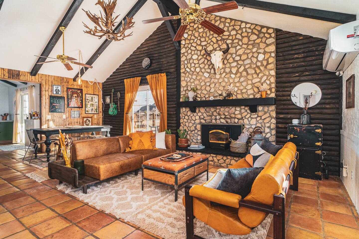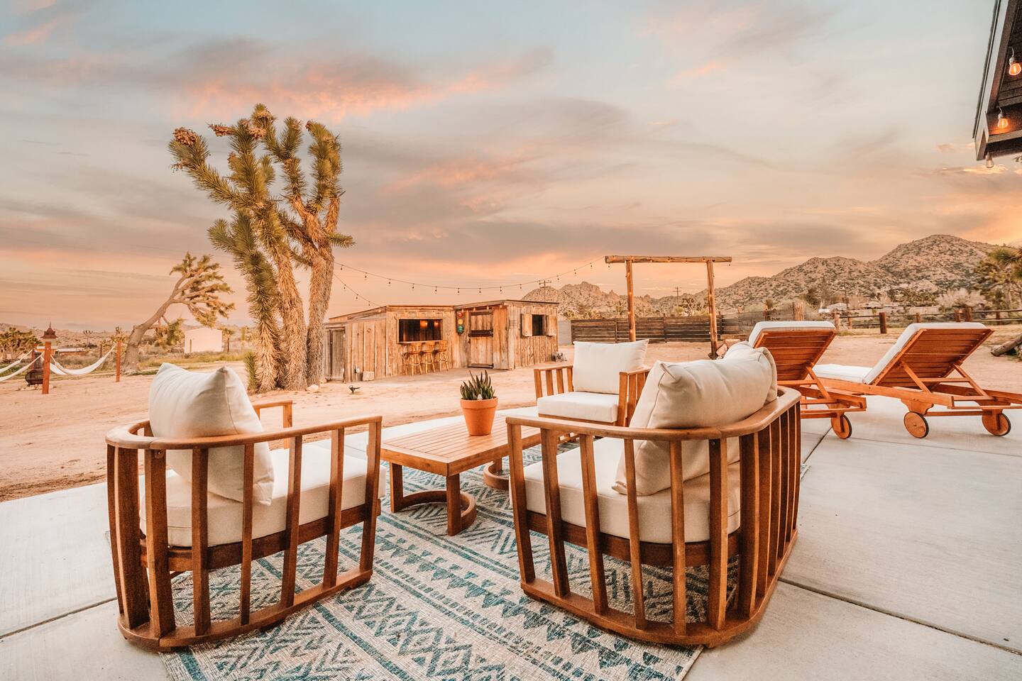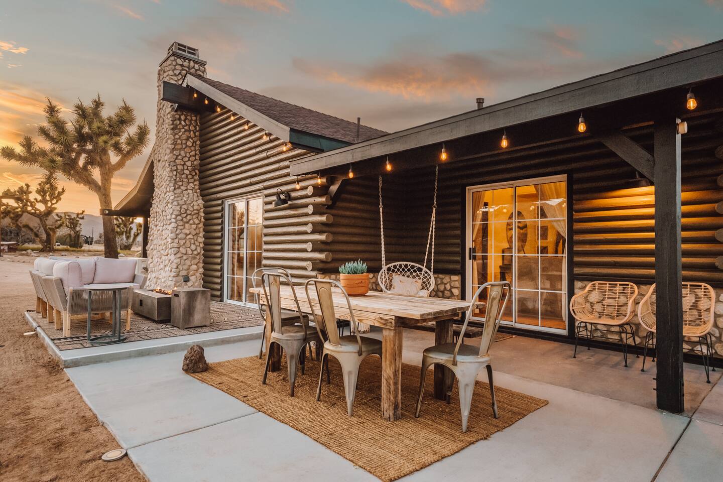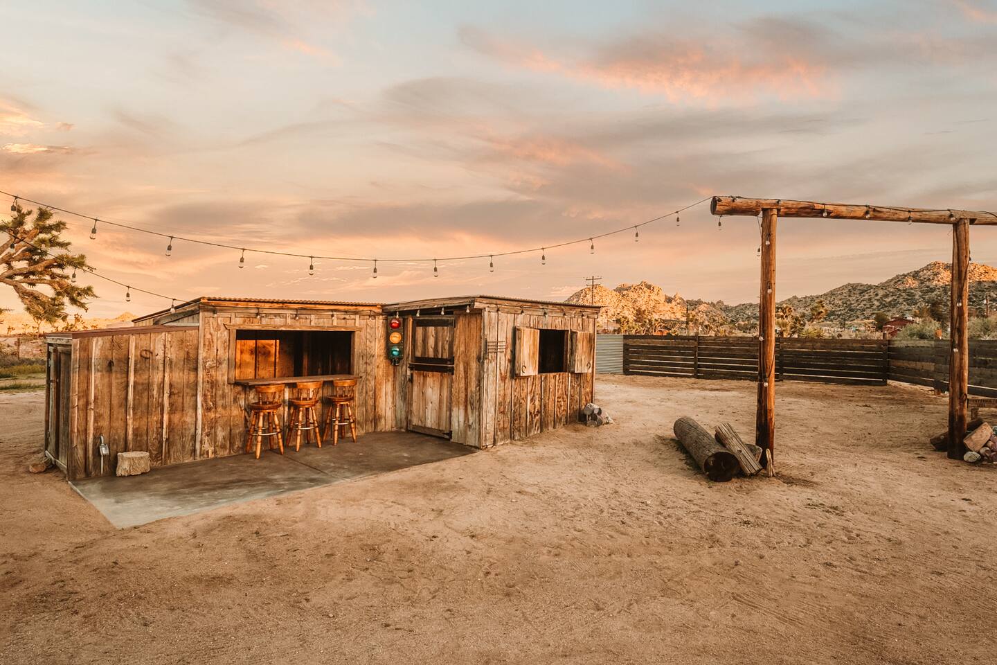 A stylish desert getaway on 4 acres in central Pioneertown, just 5 min walk to Pappy & Harriet's. Perfect for retreats, concert stays, family trips, or Natl Park adventures. ✧ Outdoor Western saloon w/ bar, piano & couch ✧ Hot tub & cowboy pool ✧ 3 bedrooms + 1 sleeping loft (2 king, 2 queen) ✧ 16' ceilings, 1600 sqft (see blueprint) ✧ Larged fenced dog yard ✧ Firepit, 3x patios, BBQ ✧ Tesla charger, fast WiFi ✧ XL indoor bathtub ✧ Hammocks Desert modern luxury meets the spirit of the west.