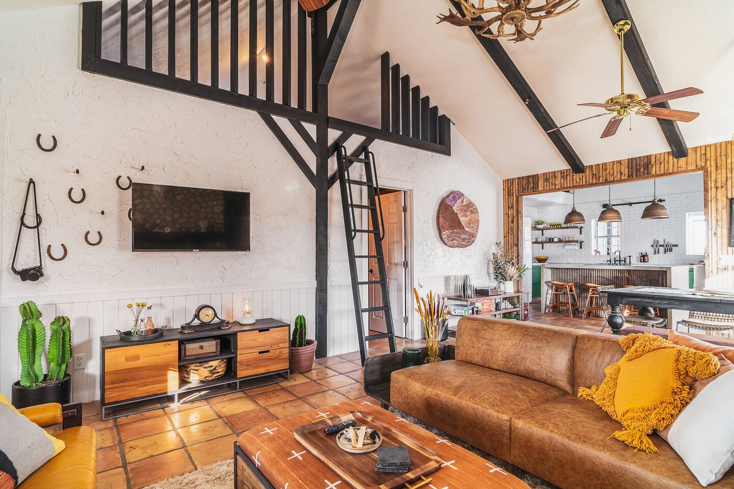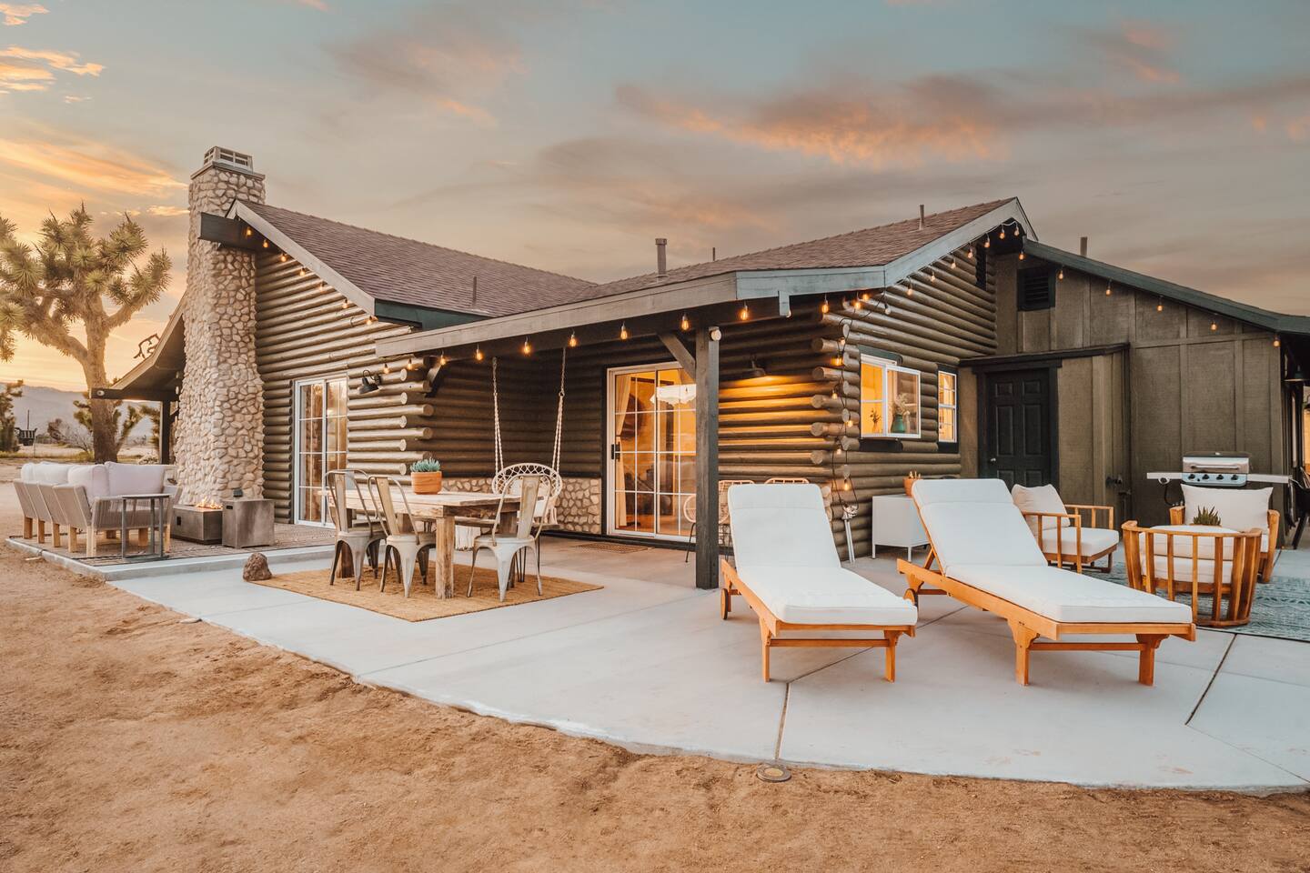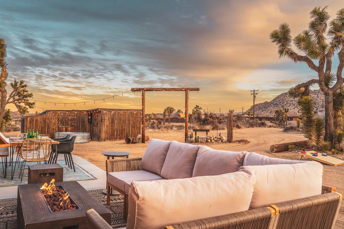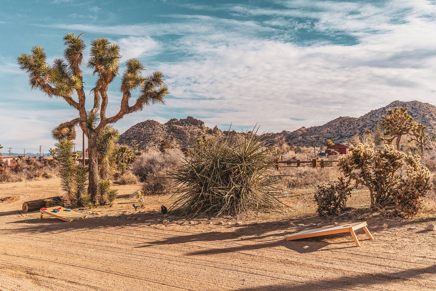 A stylish desert getaway on 4 acres in central Pioneertown, just 5 min walk to Pappy & Harriet's. Perfect for retreats, concert stays, family trips, or Natl Park adventures. ✧ Outdoor Western saloon w/ bar, piano & couch ✧ Hot tub & cowboy pool ✧ 3 bedrooms + 1 sleeping loft (2 king, 2 queen) ✧ 16' ceilings, 1600 sqft (see blueprint) ✧ Larged fenced dog yard ✧ Firepit, 3x patios, BBQ ✧ Tesla charger, fast WiFi ✧ XL indoor bathtub ✧ Hammocks Desert modern luxury meets the spirit of the west.